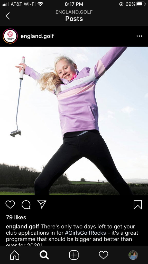 Females are often overlooked in the game of golf. There are substantially more male than female golfers and the PGA is the center for golf, and the PGA is all male. Golf represents much more than just performance. It gets people together with their friends or introduces them to people they’ve never met before. Golf gives people the passion to obtain lower scores. It is good exercise (if they do not use a cart) and gets people outside. Golf is a life sport. And this is why it is important to get everyone involved with golf, not just men. England Golf sees the opportunity to get more women playing the game. They created the Girl Golf Rocks program to get boost female participation in the sport. The program teamed up with literally hundreds of clubs across the UK for support and help host events for the program. England Golf is utilizing their social media accounts to promote Girls Golf Rocks and the events it holds. They continue to release new posts every week about new events for Girls Golf Rocks to remind people. They also include links in the caption section to help girls navigate to the correct page to sign up. I think England Golf is doing a great thing for females and the game of golf by pushing such programs.